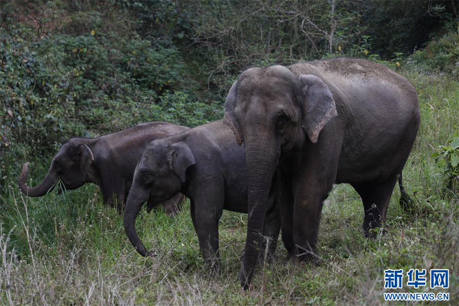 三头象一同在野外活动(3月9日摄)。新华网发(徐华陵 摄)