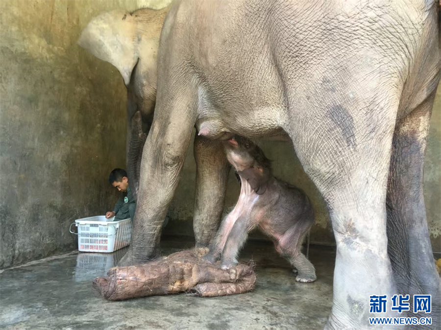 “景景”踩着棕垫喝奶(资料图)。新华网发(云南西双版纳国家级自然保护区管护局 供图)