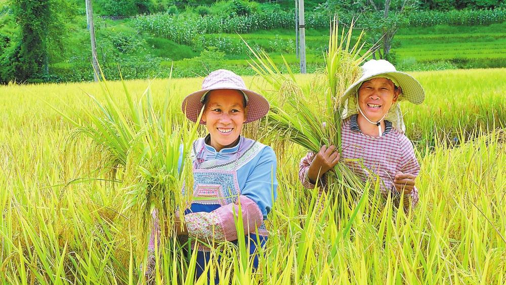师宗县五龙乡牛尾村群众收割稻谷。通讯员 贾严 摄