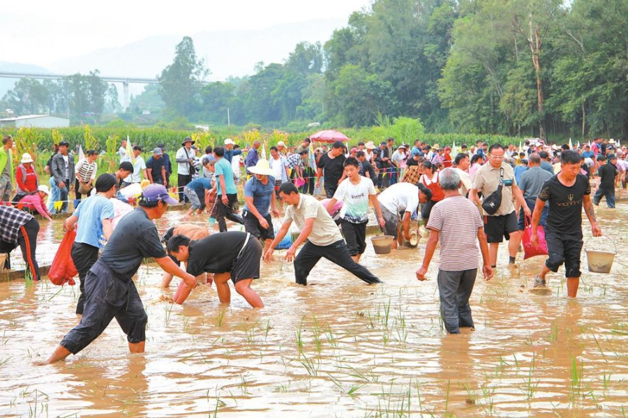 游客在稻田里捉鱼。 本报通讯员 唐啟荣 摄