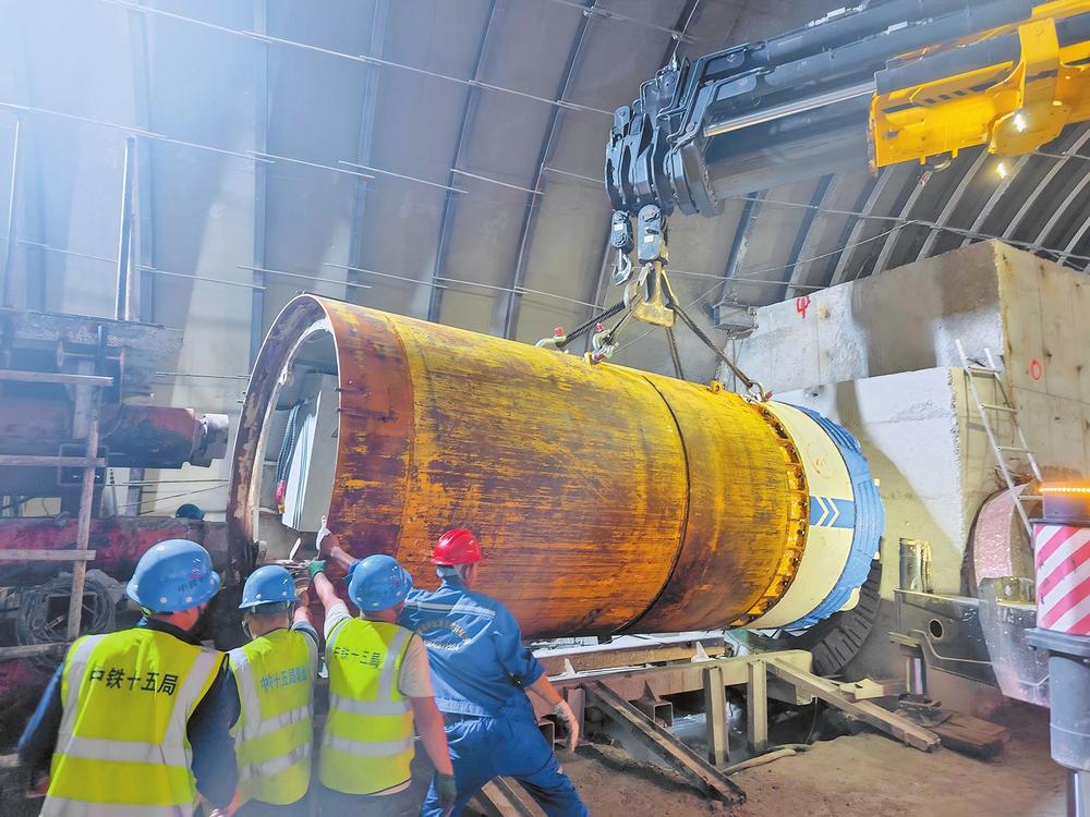 现场吊装顶管机到始发点。 通讯员 赵嘉亮 摄
