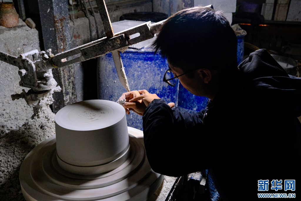 工人手工拉坯,准备制作茶叶罐(9月29日摄)。新华网发(张洪科 摄)