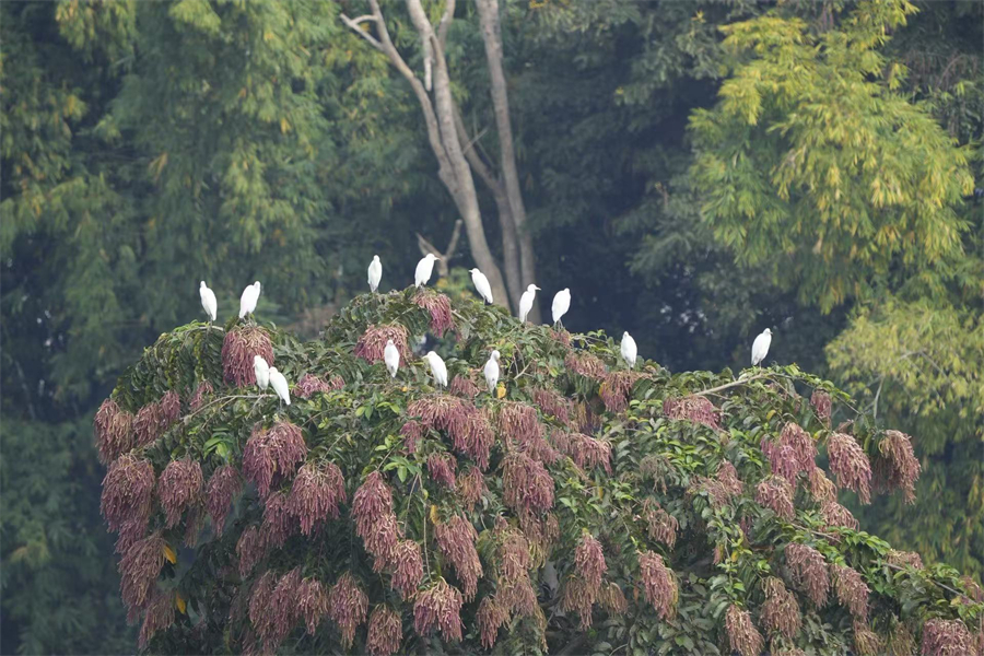 成群的牛背鹭停留在千果榄仁的树冠上(资料图)。新华网发(张鹏 摄)