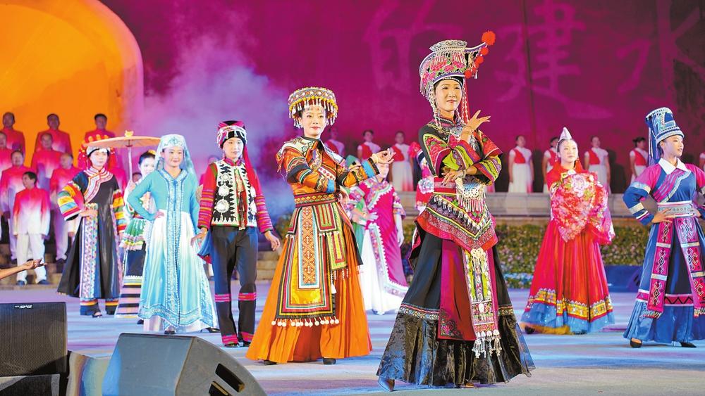 夜幕降临,古朴厚重的朝阳楼在霓虹映衬下尽显风华。随着激昂深情的《我的祖国》旋律响起,活动拉开序幕。6个走秀片段依次呈现,华服化作文明的载体,诉说不忘文化根源的初心,衣袂流转间展现山川市井文明生机。在“家园共筑·建水一家亲”主题演出中,《千年紫陶》《遇见建水》等歌曲轮番上演,以旋律展现建水的美食、美景与民俗文化。灯火映照下,游客与市民歌舞同欢,共唱幸福。