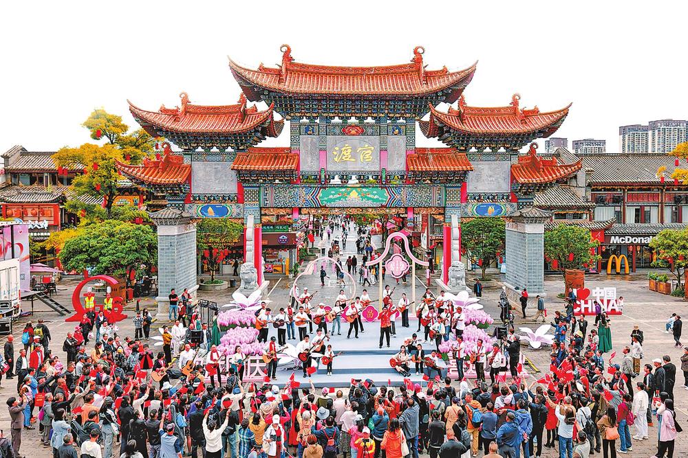 10月1日,昆明官渡古镇举办百人吉他快闪活动,唱响红色经典歌曲。 记者 胡妤雅 摄