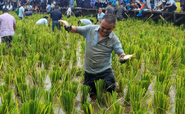 10月2日,“中国目瑙纵歌之乡”云南省陇川县启动第十六届目瑙纵歌活动周。在现场,各族群众穿上民族盛装,在“瑙双”“瑙巴”的带领下,踩着整齐有力的鼓点舞动。铿锵有力的鼓声、铓声、音乐声,瞬间点燃了现场激情,长龙一般的队伍时而穿插、时而环绕,进退有序,整个目瑙纵歌场变成一片欢乐的海洋。