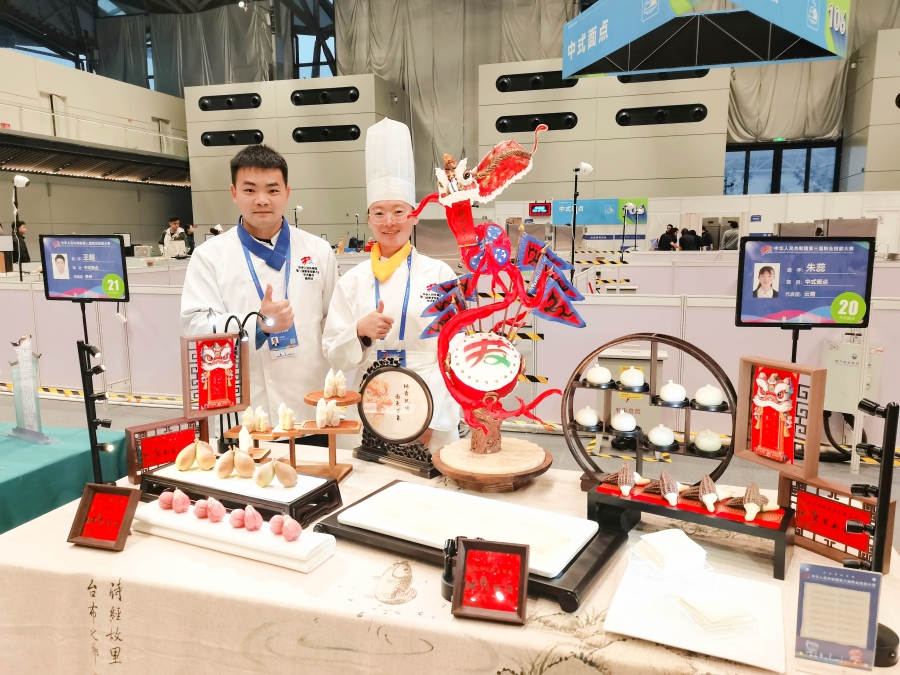 “备赛期间,实训室成了我们的‘家’,每天都是从清晨训练至午夜。”朱蕊说,为攻克技术难点,赛前需进行大量重复训练,例如为做好提褶包子,朱蕊反复练习直至能稳定做出32个匀称挺立的褶子。龙须面是朱蕊从未接触的项目,学习不仅要请“外教”,还要投入加倍的精力练习,有时甚至抻面抻到肌肉拉伤。此外,为实现传统技艺与云南特色融合,她与教练潘友瑞每日高强度训练改进工具适配技法,反复尝试调制特色馅心,不断打磨展台布置、餐具遴选等细节,最终将云南野生菌、鲜花等地方特色融入面点馅心,力求每一个细节尽善尽美。
