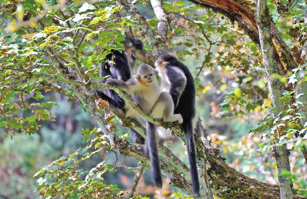近年来,云南省持续推进滇金丝猴栖息地修复工作,通过种植云杉、冷杉等树种,在白马雪山国家级自然保护区等地成功构建起连接滇金丝猴栖息地的生态廊道,滇金丝猴种群数量持续增长。目前,保护区内的滇金丝猴种群数量已增长到约2800只,占全国的65%以上。图为滇金丝猴在位于维西傈僳族自治县塔城镇的香格里拉滇金丝猴国家公园内嬉戏玩耍。(记者 黄兴能 摄)