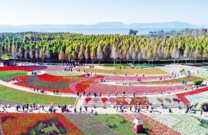 2025年初,游人在昆明捞渔河湿地公园内赏郁金香(无人机照片)。 新华社