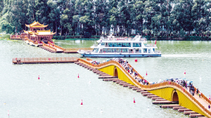 2025年10月1日,一艘游船通过位于滇池草海的东风坝开合浮桥(无人机照片)。 新华社