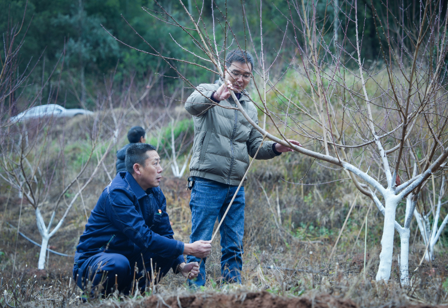 虎志刚在蜜桃基地查看桃树生长情况(3月3日摄)。冯琰 摄