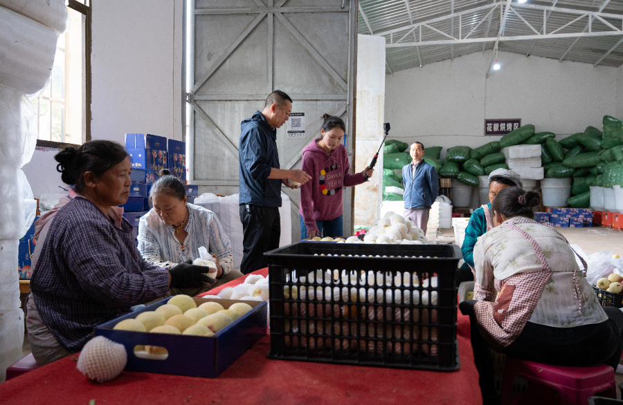 虎志刚与前来帮助宣传推广的人员介绍蜜桃产业情况(9月22日摄)。冯琰 摄