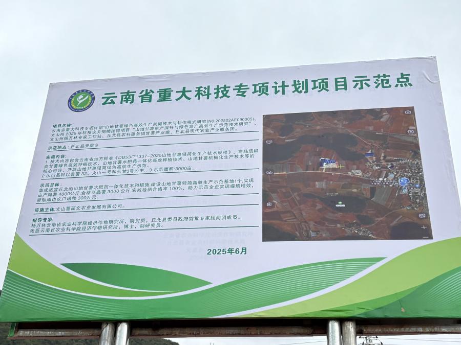 此次1800亩示范区域位于丘北县天星乡,由文山薯丽文农业发展有限公司承担实施,该公司是云南省农业科学院经济作物研究所甘薯团队重点服务的甘薯小微企业。项目实施过程中,以地方标准《DB53/T 1337-2025山地甘薯轻简化生产技术规程》为支撑,采用覆膜滴灌、节点施肥、水肥药一体、适当控旺等技术措施,同时获得该团队的一对一技术指导。