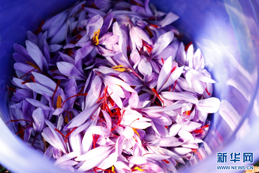新鲜采摘的藏红花(10月23日摄)。新华网发(刘云 摄)