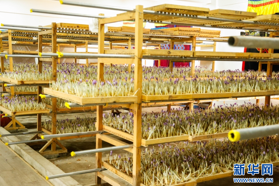 育花房里整理摆放的藏红花(10月23日摄)。新华网发(刘云 摄)