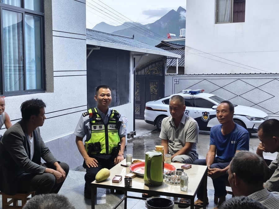 民警与村民交流沟通(8月12日摄)。