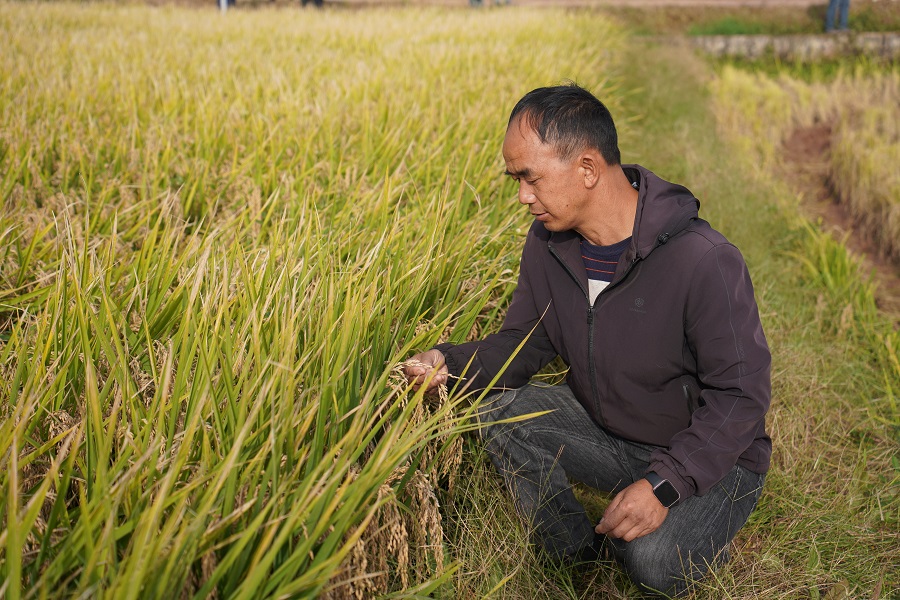 赵静丈夫在查看待采收的水稻(10月24日摄)。供图