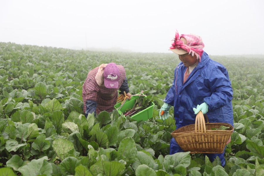 在红油菜种植基地里,小米地村村民蒲恩祝已经工作了两个多月,“在这里干活离家近,白天掐菜,晚上做打包工作,把菜理好再装箱,工作很轻松。”蒲恩祝说,基地工资每天120元,晚上加班每小时10元,这份工作给家里增加了不少收入。
