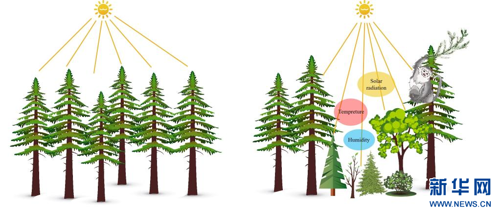 没有滇金丝猴的区域,林窗较小,植物群落单一(左图);滇金丝猴活动的区域,因其取食等行为折断林冠树枝,增大林窗,改变林下气候条件,增加了生物多样性且优化了森林结构(右图)。绘图者:李娜