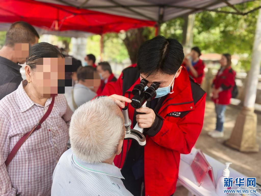 复旦大学附属眼耳鼻喉科医院院长周行涛在义诊现场为当地群众做眼部检查。新华社记者 李恒 摄