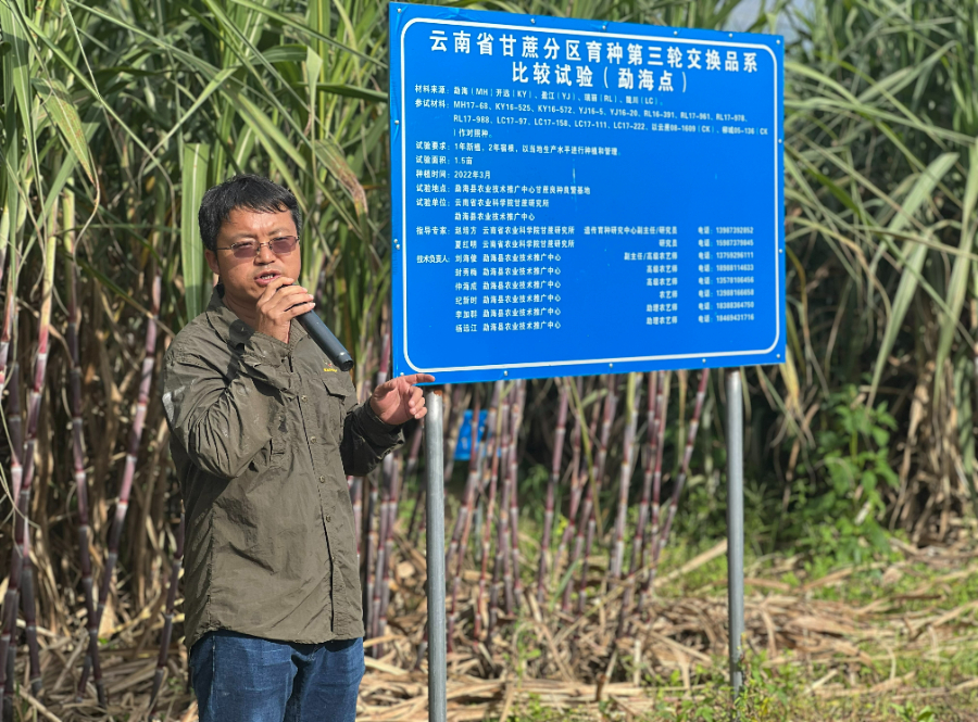 赵培方在勐海县分区育种点向制糖企业技术人员推介甘蔗新品种(2023年10月25日摄)。陆鑫 摄