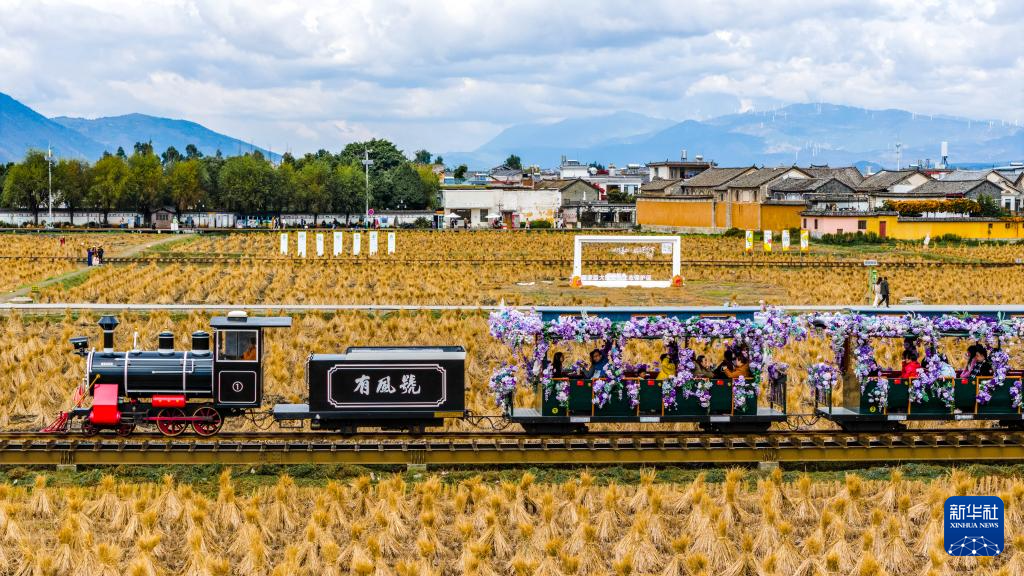 游客在喜洲古镇乘坐观光小火车(11月24日摄,无人机照片)。新华社记者 胡超 摄