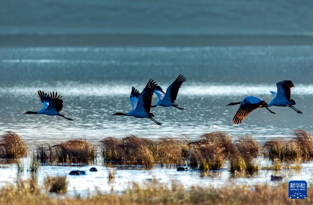 11月30日,黑颈鹤在大山包黑颈鹤国家级自然保护区内的大海子湿地飞舞。新华社发 (范晖 摄)