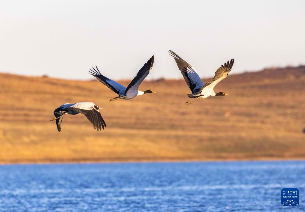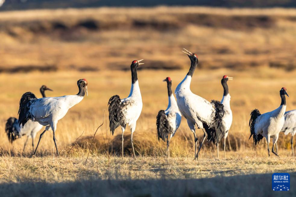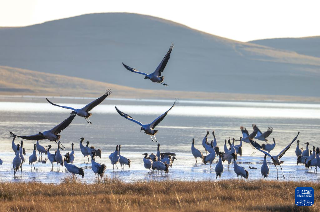 11月29日,黑颈鹤在大山包黑颈鹤国家级自然保护区内的大海子湿地飞舞。新华社发 (陈熙 摄)