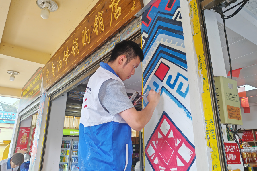 彩绘完成后,墙面吸引了众多村民和游客驻足。原本普通的小店,一跃成为村里的文化展示窗口。