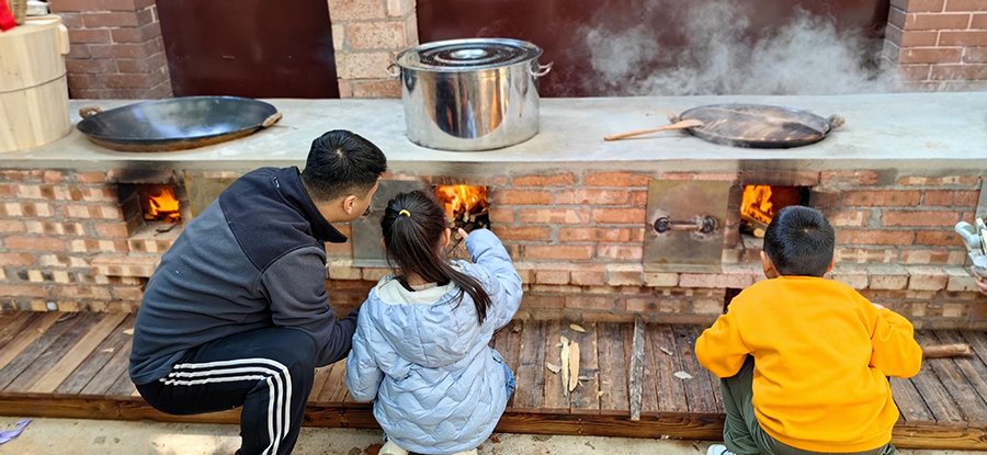 12月1日,家长和社区工作人员走进幼儿园,与孩子一同生火做饭、体验传统食育。昆明市人民政府机关幼儿园教育集团 供图