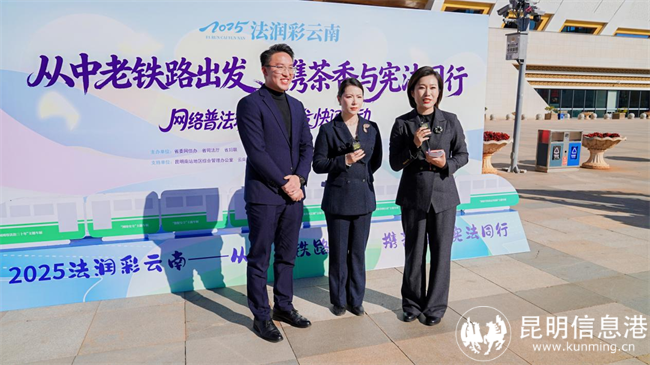 2025年12月4日,是我国第十二个国家宪法日,也是中老铁路通车四周年纪念日的次日,“法润彩云南”网络普法系列活动“从中老铁路出发 携茶香与宪法同行”网络普法快闪活动在昆明南站西广场举行。活动以茶为媒、以法为魂、以路为桥,巧妙结合云南茶文化、宪法法治宣传、中老铁路元素,为往来旅客和线上网友带来了一场“可品、可玩、可传、可感”的沉浸式普法新体验。