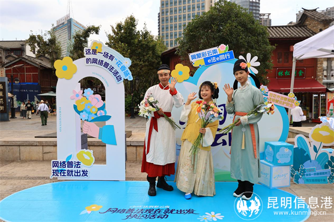 “鲜花+普法”以昆明“春城”“花都”标签为切入点,将300枝特色鲜花搭配普法标语背卡,由国风少年化身“送花郎”在昆明老街网红地标传递法治温情,活动融入非遗唐菓子制作、押花书签 DIY、普法飞行棋等互动形式,将普法场景与文旅体验深度绑定,为市民打造了一张“可以带走的网络普法城市名片”。