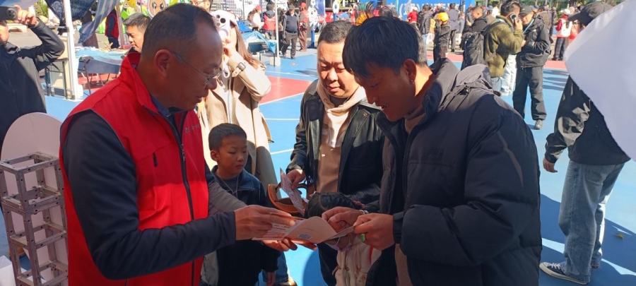 中国人寿财险大理州中心支公司工作人员为球迷提供金融保险服务(12月6日摄)。