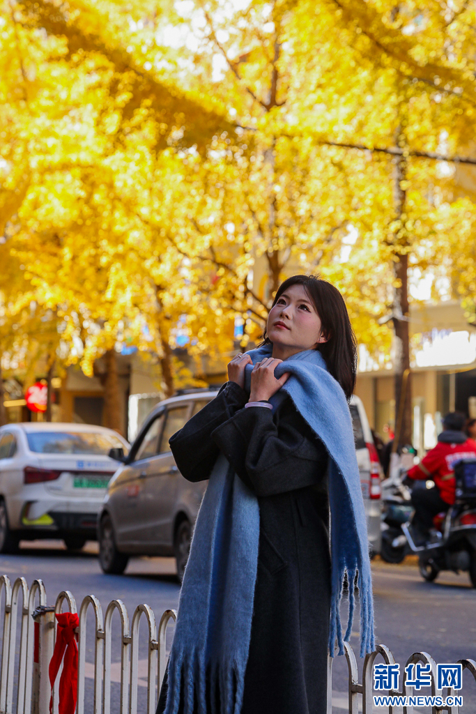 游客在昆明文林街银杏下拍照打卡(12月6日摄)。新华网发(郑益 摄)