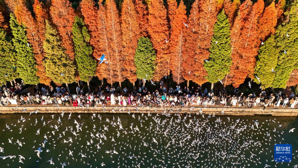 12月10日,游客在滇池畔的海洪湿地公园喂红嘴鸥(无人机照片)。新华社记者 彭奕凯 摄