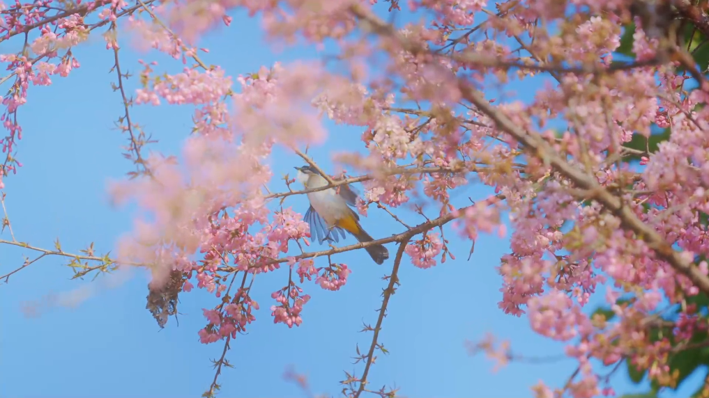 仲冬时节,昆明市晋宁区的山野、公园和道路两旁,冬樱花相继绽放。