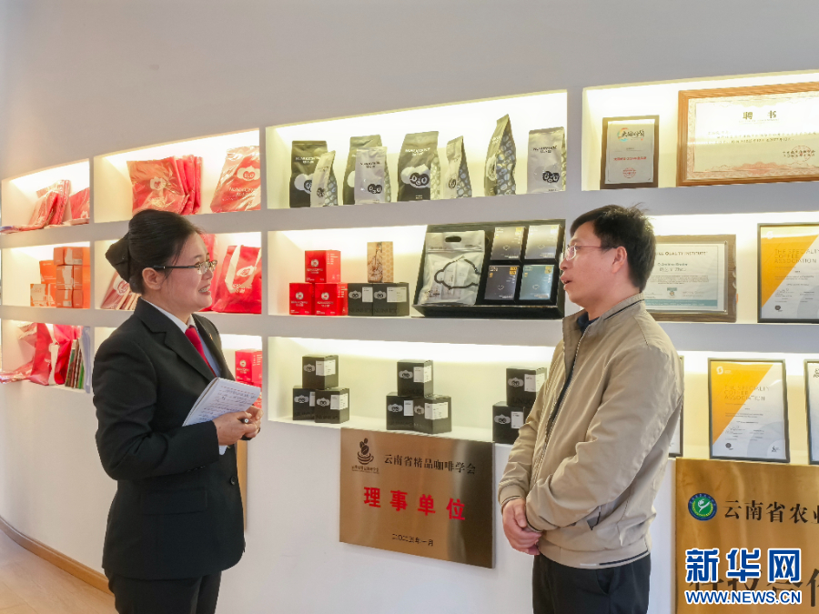 泸水法院法官深入咖啡企业开展法治宣传(12月9日摄)。新华网发(赵晓云 摄)