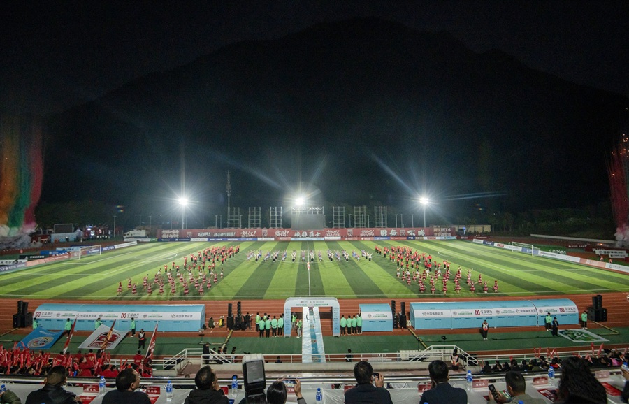 赛前,独具怒江特色的傈僳族歌舞表演轮番上演,绚烂的灯光秀瞬间点燃全场氛围,6000余名球迷齐聚赛场,为即将登场的球队呐喊助威。