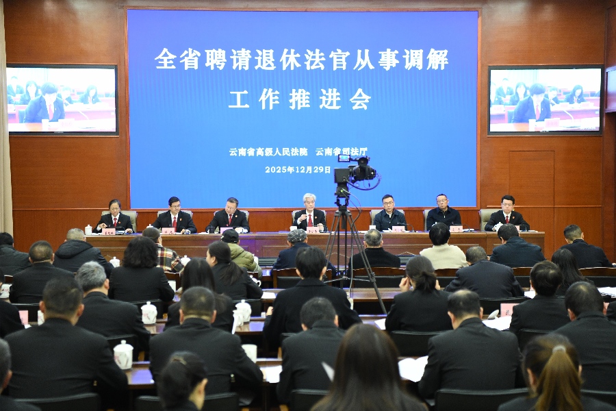 12月29日,云南省高级人民法院与云南省司法厅联合召开全省聘请退休法官从事调解工作推进会。会议以“现场+视频”形式同步开展,在云南省高级人民法院设主会场,各中级、基层法院设分会场。