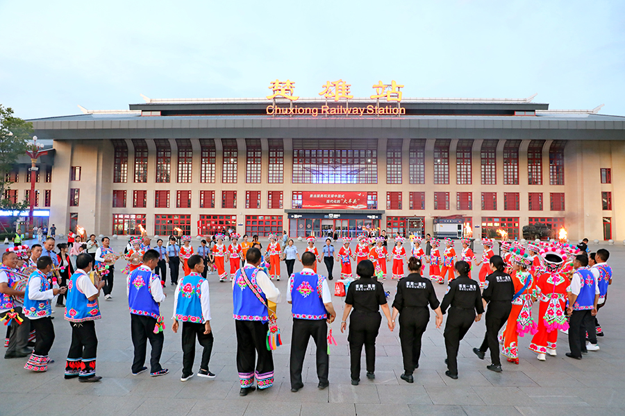 “火把节”期间车站职工与地方群众在站前广场载歌载舞(资料图)。朱万祥 摄
