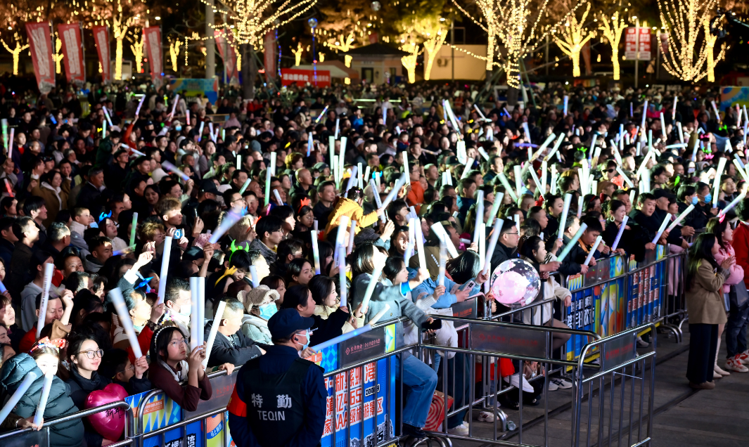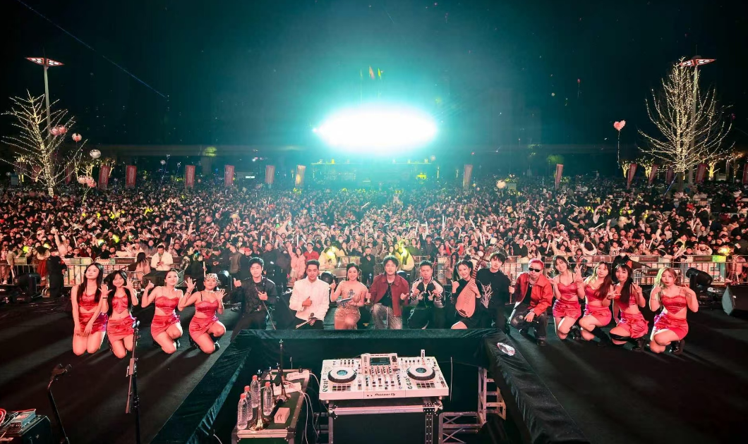 跨年主舞台自当晚19:00起持续升温,多轮乐队与特色表演轮番上演。民族舞《傣灵》、“太阳部落火舞”及本地人气说唱组合“升值兄弟”带来的歌曲表演,不断点燃观众热情。