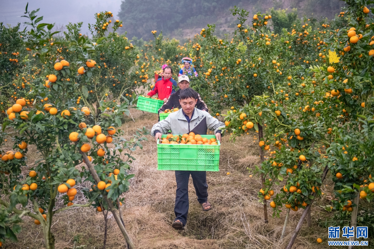 冬日里,云南省文山州马关县都龙镇的橘园基地里,饱满的橘子挂满枝头,果农们喜笑颜开,有条不紊地采摘、分拣、打包,一派丰收景象。(熊平祥)
