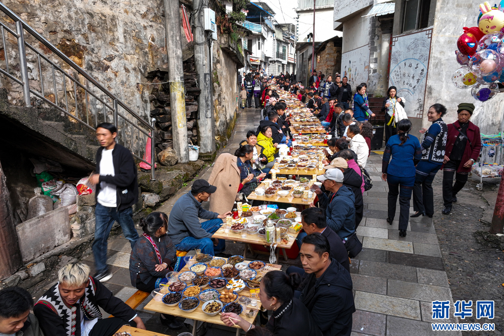游客与村民一起体验哈尼长街宴(1月4日摄)。新华网发(张洪科 摄)