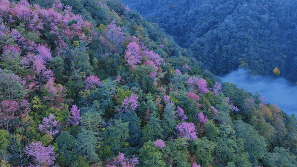 近日,在云南省腾冲市曲石镇青岩子,高山峡谷间大片野生冬樱花进入一年一度的盛花期。成百上千株野生冬樱花绽放,粉色的花朵装点在绿意之上,构成一幅唯美画卷。(完)(屈晓丽 刘正凡 张世东)