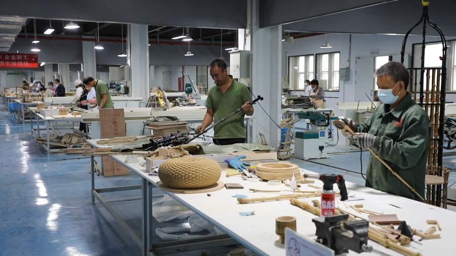 易地搬迁群众在竹材加工厂工作(2025年9月25日摄)。彭明星 摄