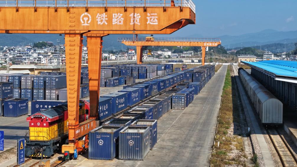 1月16日,中老铁路首趟咖啡豆货运专列整装待发(无人机照片)。