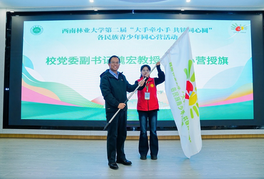 西南林业大学党委副书记魏宏为2026年同心营开营授旗,并以“开营第一课”的形式为同学们讲授民族团结进步教育课。魏宏寄语全体学员,要在“大手牵小手”的真切互动中学会彼此欣赏、互帮互助、共同成长,在践行中感悟“各美其美、美美与共”的深厚内涵,从而完成从小我到大我的成长与升华,真正成为民族团结进步的坚定维护者和积极践行者。