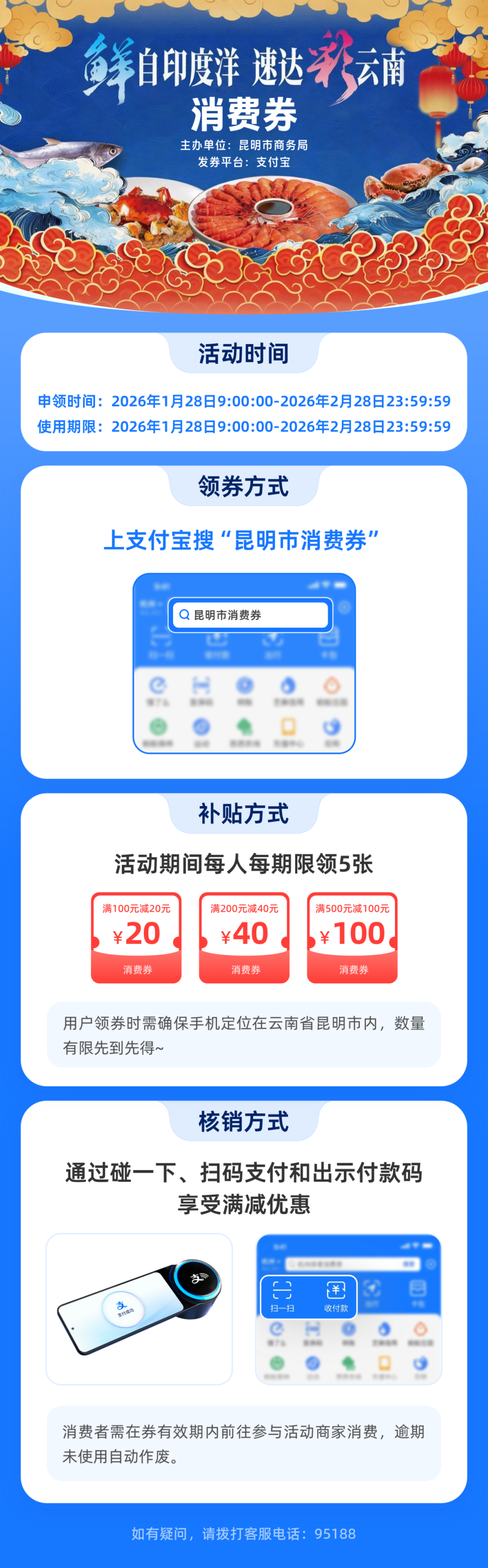 凡手机GPS定位在昆明市的个人消费者,均可通过支付宝平台参与领券。用户只需在支付宝搜索“昆明市消费券”,即可一键申领。活动期间,同一用户单日限领1次、限核销1张,消费券自领取当日内有效(以参与商户闭店时间为准),使用或过期后可重新领取,累计最多可领取5次。消费券数量有限,先到先得,用完即止,2026年2月28日23:59:59前未核销的券将自动失效。