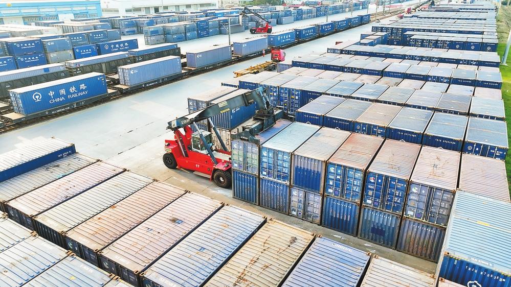 中老铁路“澜湄快线”国际货运列车吊装货物。 通讯员 周靖博 摄