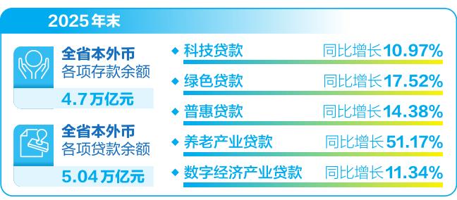金融“五篇大文章”贷款总量快速增长。2025年末,全省金融“五篇大文章”贷款余额1.81万亿元,同比增长13.26%。其中,科技贷款同比增长10.97%,绿色贷款同比增长17.52%,普惠贷款同比增长14.38%,养老产业贷款同比增长51.17%,数字经济产业贷款同比增长11.34%,均高于各项贷款增速。